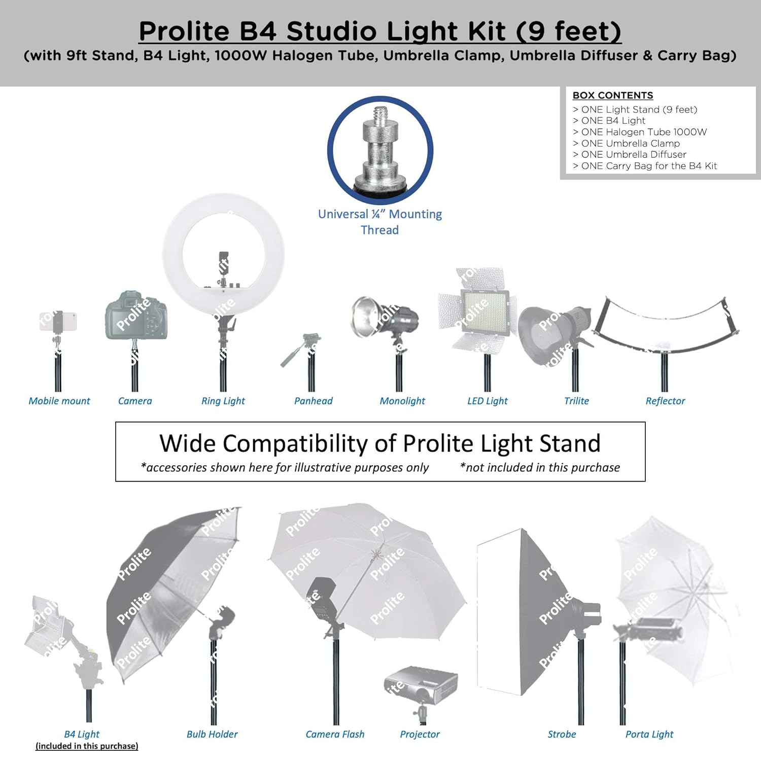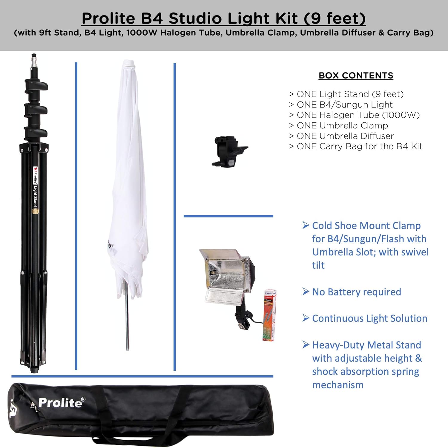 Prolite Studio B4 Continuous Video Light Kit – 1000W Halogen, 9 ft Stand, Umbrella, Carry Bag for Photography & Videography